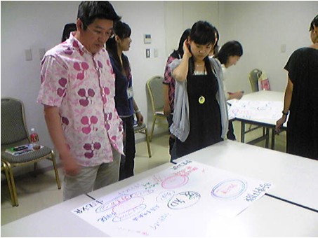 打ち合わせのあと、メンバーのみなさんと一緒に、ごく簡単なワークショップをやってみました。「ローカルの不思議」というプロジェクトの一環として編み出された、異なる地域のイメージを模造紙に描いていくワークショップです。その仔細については割愛しますが(→「ローカルの不思議」については、こちらの論文を参照して下さい)、南海放送のある「愛媛」のほか、水越、小川、飯田それぞれのホームタウンである「石川」、「愛知」、「広島」のイメージを互いに出し合い、話し合うということをしました。この局で考案しているプロジェクトと直結するわけではないですが、これまで民放連プロジェクトでおこなわれてきた活動と親和性があり、今年度に関していえば、岡山放送の実践と深く関係しているということで、みんなで体験してみたわけです。![]()